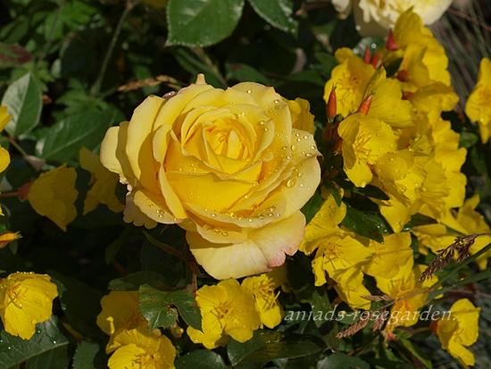 Róża wielkokwiatowa, kwiaty duże, pełne i pachnące.Świeżo rozwinięte kwiaty są żółte, wraz z przekwitaniem